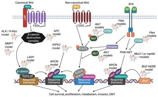 This section highlights the various signaling pathways characteristic of PCa, illustrating how PCa mouse models represent what happens in the context of human cancers. For each signaling pathway, the major players, or genes, that are affected are included, as well as the specific models that study those particular genes. Although the number of signaling pathways disrupted in PCa is essentially innumerable, the six below have been chosen to be investigated due to their significance in PCa pathology.