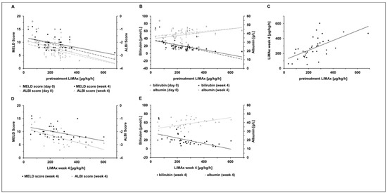 LiMAx was assessed in 69 patients before and in 37 (53.6%) patients at week 4 after transarterial treatment. Before transarterial treatment, LiMAx results showed intermediate correlation with bilirubin (r = −0.569, p = 0.0004) albumin (r = 0.399, p = 0.016), with AST (r = −0.490, p = 0.002) and with INR (r = −0.365, p = 0.026). LiMAx results showed intermediate correlation with ALBI score (r = −0.569, p = 0.0003 and MELD score (r = −0.504, p = 0.002) (Figure 2).