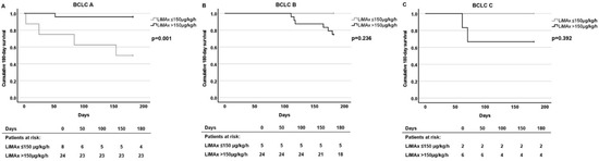 Remarkably, when the patients were divided into groups according to the BCLC stage, significant differences in survival rates were detected between patients with LiMAx ≤ 150 μg/kg/h and with LiMAx > 150 μg/kg/h levels for BCLC A but not for BCLC B and C groups. In the BCLC B group, no patient died within 90 days, and in the BCLC C group, no patient died within 60 days. The 90-day survival rates of the BLCL C group were not significantly different according to the LiMAx ≤ 150 μg/kg/h and LiMAx >150 μg/kg/h groups (p = 0.392). In contrast, the survival rates of patients with BCLC A stage with LiMAx ≤ 150 μg/kg/h were significantly lower after 30 days (75.0 ± 15.3% vs. 100%, p = 0.011) and 90 days (62.5 ± 17.7% vs. 95.8 ± 4.1%, p = 0.011) compared to those patients with higher LiMAx levels. This was even more pronounced after 180 days for BCLC A with an estimate of 50.0 ± 17.7% vs. 95.8 ± 4.1%, p = 0.00; in contrast to BCLC B with an estimate of 100% vs. 75.0 ± 8.8%, p = 0.236; and BCLC C with an estimate of 100% vs. 66.7 ± 19.2%, p = 0.392, respectively (Figure 4).