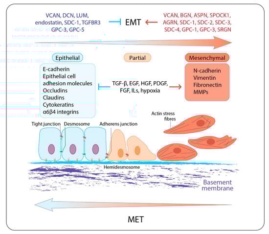 Overview of EMT: epithelial cells are anchored to the underlying basement membrane by hemidesmosomes and are interconnected by tight junctions, adherens junctions, and desmosomes. They express specific cell surface and cytoskeletal proteins associated with epithelial phenotype such as E-cadherin, epithelial cell adhesion molecules, occludins and claudins, epithelial cell-associated integrins α6β4, and cytokeratins. EMT is triggered by numerous growth factors, cytokines, and hypoxia, which activate a transcription program, which is associated with the inhibition of the expression of epithelial-related genes and the induction of the expression of mesenchymal-related genes including N-cadherin, vimentin, ECM molecules, fibronectin, and MMPs. Mesenchymal cells display increased motility and invasiveness. Epithelial cells during their progressive transition to a mesenchymal phenotype acquire an intermediate state (partial EMT), into which cells exhibit a mixed cell phenotype expressing both epithelial and mesenchymal markers. PGs are involved in the EMT program affecting, among others, EMT-related signaling pathways acting either as inducers or as inhibitors. EMT can be reversed where the mesenchymal cells can revert to the epithelial phenotype by undergoing MET. Both EMT and MET occur during cancer progression and the development of distant metastases.