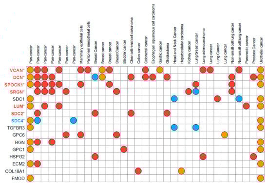 PGs participate in cell–cell and cell–matrix interactions and oncogenic signaling affecting cancer cell phenotype and functional properties. Differential expression of PGs is associated with EMT in various cancer types, and multiple PGs have been identified in proposed EMT signatures deposited in the EMTome database (http://www.emtome.org/ (accessed on 19 August 2022)) [41] (Figure 2).