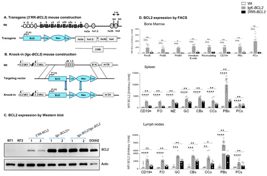 Mouse model construction schematics for (A) 3′RR-BCL2 transgenics and (B) Igκ-BCL2 knock-in mice. (C) Western-blot evaluation of human BCL2 protein expression in the spleen of WT (negative control), 3′RR-BCL2, Igκ-BCL2 ∆/+, Igκ-BCL2 ∆/∆ mice, and in the DoHH2 human cell line (positive control). (D) Human BCL2 expression in both mouse models, using the mean fluorescent intensity (MFI) obtained by flow cytometry from bone marrow, spleen, and mesenteric lymph nodes B-cells from unimmunized 3′RR-BCL2 and Igκ-BCL2 ∆/+ only. (* p < 0.05; ** p < 0.01; *** p < 0.001; **** p < 0.0001).