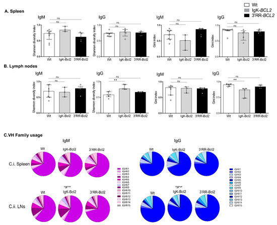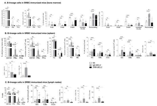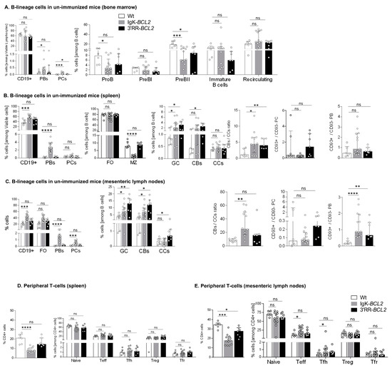 3.3. Lymphoid Compartments and Response to Immunization in BCL2 Mice