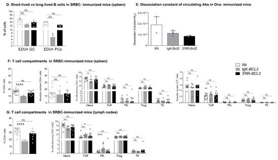 Immune responses in immunized mice (A–C) Impact of BCL2 deregulation on the immune response of immunized mice lymphoid tissues (bone marrow, spleen, and mesenteric lymph nodes, respectively), of intra-peritoneal immunization (3 iterative SRBC injections, on a monthly basis). B cells were evaluated by flow cytometry in BCL2 mice compared to WT. The ratios of centroblasts to centrocytes, as well as CD93+ / CD93- plasma cells and plasmablasts, are indicated. Percentages of the different populations, as well as absolute cell numbers (calculated based on the percentages obtained by flow cytometry and the total amount of lymphocytes in each organ), are presented as medians with interquartile range: statistical significance was determined using the Mann–Whitney U test. The full staining panel and gating strategy are summarized in Supplementary Table S1 and Supplementary Figure S1A–S1C. (D) Flow cytometry analysis of splenocytes stained with EDU (24 h post intraperitoneal EDU injection and 7 days after SRBC immunization) in WT (5), Igκ-BCL2 ∆/+ (4) and 3′RR-BCL2 mice (5). The percentages of EDU-stained plasma cells (EDU+ PC) and GC B cells (EDU+ GC) are medians with interquartile range. Statistical significance was determined using Mann–Whitney U test. EDU staining was revealed by coupling to Alexa 488, together with specific markers for plasma cells (CD138 BV786), GC B cells (GL7-APC and CD38-APC-R700), and cell viability (FVS 780). (E) Affinity of anti-Ova antibodies. Histogram of the dissociation constant (KD) of IgG to Ova, evaluated by ELISA, in the sera of BCL2 mice compared to WT. Lower KD marks a higher affinity for Ova. KD values are medians with interquartile range. (F,G) Flow cytometry data showing the impact of the BCL2 deregulation accompanied with 3 iterative intra-peritoneal SRBC injections (on a monthly basis) on the different T cell populations, in both BCL2 mouse models compared to WT, in the periphery (spleen and LNs). Both percentages and absolute cell numbers of each T cell population are presented as medians with interquartile range, and the statistical significance is realized via the Mann–Whitney U test. (* p < 0.05; ** p < 0.01; *** p < 0.001; **** p < 0.0001).
