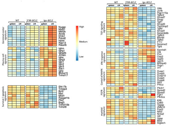 A strong GC signature was also noticeable in Igκ-BCL2 samples, especially in lymph nodes. However, in contrast to 3′RR-BCL2 samples, Igκ-BCL2 samples differed from WT for several additional signatures (Figure 4). The more prominent one was a strong plasma cell signature including constant Ig heavy and light chain genes but also Jchain, Sdc1 (Syndecan 1), Bhlha15 (Mist1), and Tnfrsf17 (BCMA), which are all classical markers of plasmablasts and plasma cells [43,44,45]. Additional changes notably consisted of significantly down-regulated genes and thus did not correspond to signatures expressed by expanded B-cells but rather reflected a global impact of the B-cell and plasma cell expansion on other cells from the lymphoid tissue microenvironment. This included the down-regulation of many genes involved notably in TGFβ responses, but also in the inhibition of MAPK-dependent and of growth-factor-dependent responses. In addition, many myeloid-lineage specific genes, including Klf6, CD83,Tagap, Fosl2, and Id2, showed a clear down-regulation in Igκ-BCL2 samples, while a few of them were up-regulated (such as Bst2 and Siglec-H, two genes notably expressed in plasmacytoid dendritic cells) [46], altogether suggesting a change in the polarization of myeloid cells in the microenvironment of lymphoid tissues with BCL2-deregulated B cells (Figure 4).