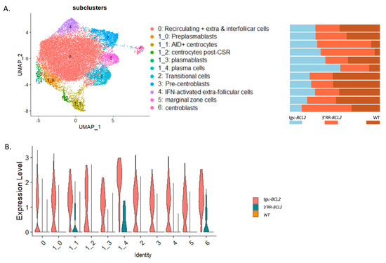 Single-cell RNAseq analysis of splenocytes from immunized mice: (A, left panel) UMAP of the 10× single cell analysis of spleen B-cells 10 days after SRBC immunization, split into 12 clusters (as defined in Supplementary Figure S2). (A, right panel) Quantitative variations in cell numbers in the various clusters in Igκ-BCL2 and 3′RR-BCL2 mice compared to WT. (B) Human BCL2 expression level in the various cell clusters in Igκ-BCL2 and 3′RR-BCL2.