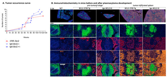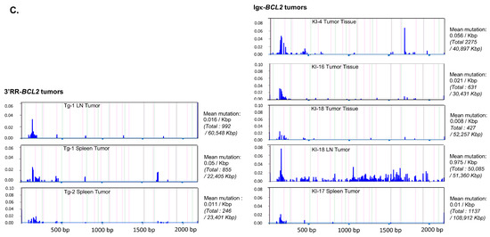 - Spleen, mesenteric LNs, and tumoral tissues from mice affected with tumors, including 8 Igκ-BCL2 knock-in mice (5 Igκ-BCL2 homozygous + 3 hemizygous), and the single 3′RR-BCL2 transgenic mouse that developed lymphoma.