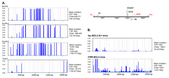 Contrary to our expectations, the presence in those mouse models of a complete P1/P2 BCL2 promoter fragment, including the negative regulatory sites for BCL6 binding, does not repress BCL2 expression in GC B-cells strongly express the mouse transcription factor Bcl6. This promoter is not affected either by obviously acquired mutations unleashing expression in some B-cell clones. Although the P1/P2 fragment is accessible to a significant amount of SHM, notably when inserted in the Igκ locus, these mutations rather seem to accumulate randomly at a low level. The spontaneously high expression of BCL2 in either model appears sufficiently high by itself for supporting the outgrowth of clonal malignant tumors without the need for promoter mutations.