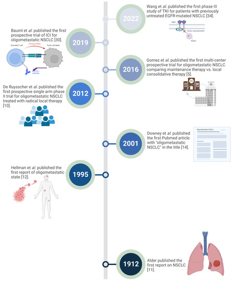 Historical Landmarks in Oligometastatic NSCLC. (NSCLC: Non-small cell lung cancer; ICI: Immune checkpoint inhibitors; TKI: Tyrosine kinase inhibitors; EGFR: Epidermal growth factor receptor).