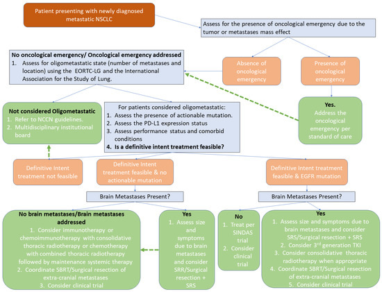 Oligometastatic NSCLC is often perceived as a favorable therapeutic opportunity during which aggressive therapy can yield favorable outcomes approaching those of patients with non-metastatic NSCLC. Under this perspective, the management of patients with oligometastatic NSCLC requires a multi-disciplinary approach. For patients with initial presentation suggestive of metastatic NSCLC, the primary objective of the diagnostic and therapeutic assessment is to determine whether the presentation can be appraised as oligometastatic. Such determination can be ideally made based on the EORTC-LG and the International Association for the Study of Lung cancer consensus [20], the patient’s performance status, comorbid conditions, and the feasibility of a definitive intent treatment. In addition, the presence or not of actionable mutations and the programmed death-ligand (PD-L1) expression status should be determined.