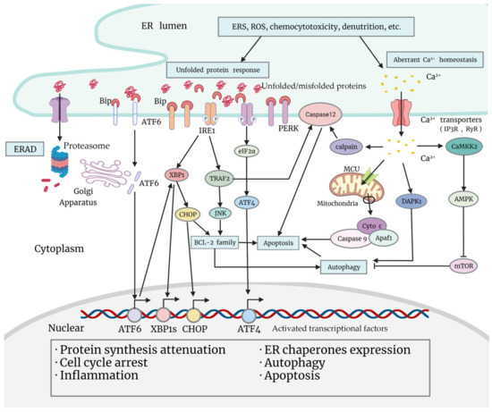 One essential function of the ER is the synthesis, folding, maturation, quality control, degradation, and proper delivery of secretory and transmembrane proteins [17]. Enormous biosynthetic load as well as multiple unfavorable factors (calcium imbalance, redox reaction, hypoxia, glycopenia, acidosis, etc.) place special demands on the ER, and promote the ERSR in order to restore homeostasis [18] (Figure 1). During the UPR, the principal part of the ERSR, chaperones are activated and dissociated from transmembrane sensor proteins on the ER membrane [18]. These changes lead to the activation of downstream signaling pathways, and to the reprogramming of a myriad of cell events, which may be pro-survival or pro-death [18]. Apart from the UPR, Ca2+ leakage from the ER is also activated under ERS, and is associated with tumor chemoresistance, which will be illustrated in “Section 4”.