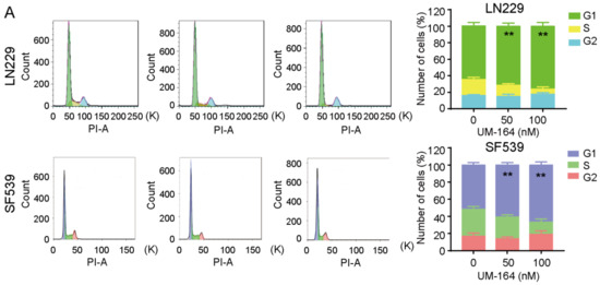 To investigate the mechanism by which UM-164 inhibits glioma cell proliferation, we determined whether the inhibitory effect of UM-164 on the tested glioma cells is related to cell cycle progression by flow cytometry analysis. As shown in Figure 2A, treatment of LN229 cells with 50 or 100 nM UM-164 significantly increased the number of cells in G1 phase from 64.95% (control) to 71.44% and 75.79%, respectively. The number of cells in the G1 phase increased from 51.64% to 60.80% and 66.68%, respectively, in UM-164-treated SF539 cells, indicating that UM-164 induces cell cycle arrest.
