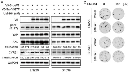 Given that UM-164 is a dual inhibitor of c-Src and p38, we next asked whether UM-164 inhibits glioma cell growth mainly via c-Src and/or p38. To clarify this, we transfected V5-Vector, V5-Src-WT and V5-Src-Y527F or Flag-Vector and Flag-p38 WT into LN229 and SF539 cells, and then treated the cells with UM-164. The results in Figure 5A showed that V5-tagged Src and its constitutively activate mutant partly rescued the UM-164-induced reduction of AXL and CYR61 abundance in glioma cells. Noteworthy, ectopic expression of p38 MAPK completely blocked the downregulation of YAP target proteins by UM-164 (Figure 5B), indicating that p38 MAPK is responsible for the UM-164-induced decrease in the levels of AXL and CYR61. Accordingly, p38 MAPK overexpression significantly reverted UM-164-repressed colony sphere formation in LN229 and SF539 cells compared to vector control (Figure 5C,D). Together, these results suggest that p38 MAPK but not Src might be the key mediator in UM-164-mediated anti-YAP activity and suppression of glioma cell growth.