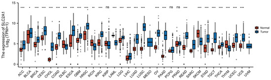 SLC2A1 expression in pan-cancer. ACC, adrenocortical carcinoma; BLCA, bladder urothelial carcinoma; BRCA, breast invasive carcinoma; CESC, cervical squamous cell carcinoma and endocervical adenocarcinoma; CHOL, cholangiocarcinoma; COAD, colon adenocarcinoma; DLBC, lymphoid neoplasm diffuse large B-cell lymphoma; ESCA, esophageal carcinoma; GBM, glioblastoma multiforme; HNSC, head and neck squamous cell carcinoma; KICH, kidney chromophobe; KIRC, kidney renal clear cell carcinoma; KIRP, kidney renal papillary cell carcinoma; LAML, acute myeloid leukemia; LGG, brain lower grade glioma; LIHC, liver hepatocellular carcinoma; LUAD, lung adenocarcinoma; LUSC, lung squamous cell carcinoma; MESO, mesothelioma; OV, ovarian serous cystadenocarcinoma; PAAD, pancreatic adenocarcinoma; PCPG, pheochromocytoma and paraganglioma; PRAD, prostate adenocarcinoma; READ rectum adenocarcinoma; SARC, sarcoma; SKCM, skin cutaneous melanoma; STAD, stomach adenocarcinoma; TGCT, testicular germ cell tumor; THCA, thyroid carcinoma; THYM, Thymoma; UCEC, uterine corpus endometrial carcinoma; UCS, uterine carcinosarcoma; UVM uveal melanoma(ns, p ≥ 0.05; *, p < 0.05; **, p < 0.01; ***, p < 0.001).