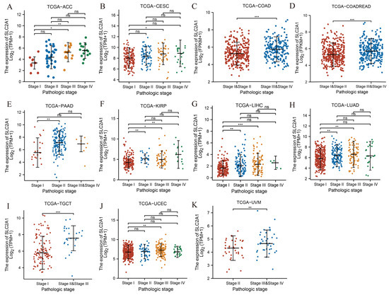 Pan-cancer differential expression of SLC2A1 in different pathologic stages in indicated tumor types from TCGA database (A–K) (ns, p ≥ 0.05; *, p < 0.05; **, p < 0.01; ***, p < 0.001).