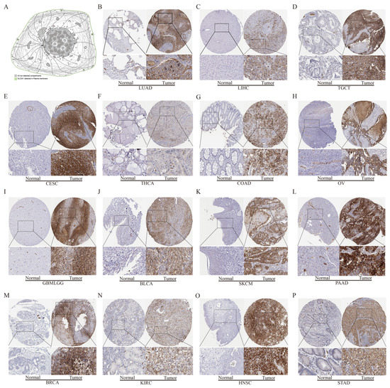 Protein level analysis of SLC2A1 in pan-cancer. Subcellular localization of SLC2A1 in cancer cells per the HPA database (A); immunohistochemical data of SLC2A1 in pan-cancer from HPA dataset (B–P).