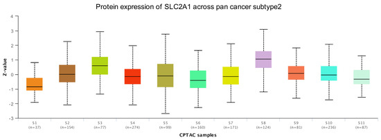 The previous results confirmed that SLC2A1 is highly expressed in most cancers at the mRNA level, but whether SLC2A1 is also highly expressed at the protein level needed further exploration. We used the HPA database to verify the protein expression level of SLC2A1. The subcellular localization of SLC2A1 in cancer cells indicated that it is predominantly expressed in the plasma membrane (Figure 4A). The HPA database included 20 types of immunohistochemistry data on cancers. We found that SLC2A1 was strongly or medium stained in most cancers, but was negative or weakly stained in most normal tissues. The detailed information was as follows: lung (weak) vs. LUAD (strong), liver (negative) vs. LIHC (strong), testis (weak) vs. TGCT (strong), cervix (negative) vs. CESC (strong), thyroid (weak) vs. THCA (medium), colon (negative) vs. COAD (strong), ovary (weak) vs. OV (strong), brain (negative) vs. GBMLGG (strong), bladder (negative) vs. BLCA (strong), skin (weak) vs. SKCM (strong), pancreas (weak) vs. PAAD (strong), breast (negative) vs. BRCA (strong), kidney (weak) vs. KIRC (strong), tongue (negative) vs. HNSC (strong), and stomach (weak) vs. STAD (strong) (Figure 4B–P). The above results indicated that SLC2A1 is highly expressed in most cancers at the protein level. In addition, we analyzed the protein expression of SLC2A1 of 2002 patients across 14 cancer subtypes in the CPTAC samples based on UALCAN data. In the CPTAC samples, we found 11 proteome-based subtypes (s1–s11), and the statistical results between 2 of the 11 subtypes are shown in Table S4. High SLC2A1 expression strongly correlated with proteome-based subtype s8 (Figure 5). These findings suggested that SLC2A1 may have an important regulatory role in the progression of various cancers and may be related to the immune system process, extracellular region, and glycolysis.