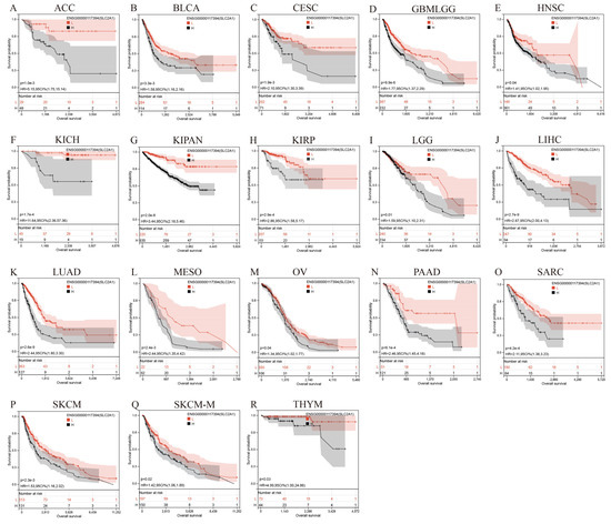 Pan-cancer Kaplan–Meier overall survival of SLC2A1 in indicated tumor types from TCGA database (A–R).