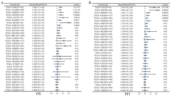 Univariate Cox regression analysis of SLC2A1. Forest map shows univariate Cox regression results of SLC2A1 for OS (A) and PFI (B) in pan-cancer.