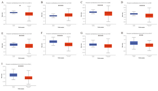Promoter methylation level of SLC2A1 in pan-cancer: BLCA (A), COAD (B), KIRC (C), LIHC (D), LUAD (E), LUSC (F), UCEC (G), TGCT (H), and THCA (I) (*, p < 0.05; ***, p < 0.001; ****, p < 0.0001).