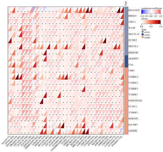 Relationship between SLC2A1 expression and RNA m6A-methylation-related genes in pan-cancer (*, p < 0.05).