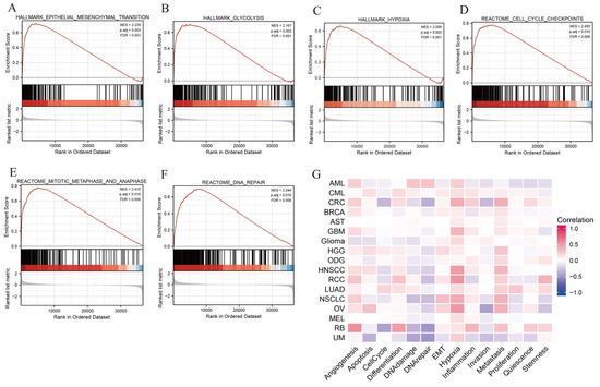 GSEA of SLC2A1-related DEGs based on HALLMARK gene sets (A–C) and based on REACTOME gene sets (D–F); single-cell analysis based on the CancerSEA database (G).