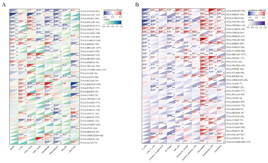 TME plays an important role in the occurrence and development of cancers. First, we used three algorithms, ESTIMATEScore, MCP-counter score, and EPIC [18,19,20], to evaluate the tumor immune infiltration in pan-cancer from the TCGA dataset via the SangerBox website (http://vip.sangerbox.com/home.html, accessed on 14 July 2022), which is a useful online platform for TCGA data analysis. Second, we compared the differences in ImmuneScore, StromalScore, and ESTIMATEScore between patients from the low-SLC2A1 and high- SLC2A1 groups with Wilcoxon signed-rank test. In addition, Spearman’s correlation analysis was used to evaluate the relationship between SLC2A1 and the tumor immune infiltration evaluated by the MCP counter score and EPIC algorithms.