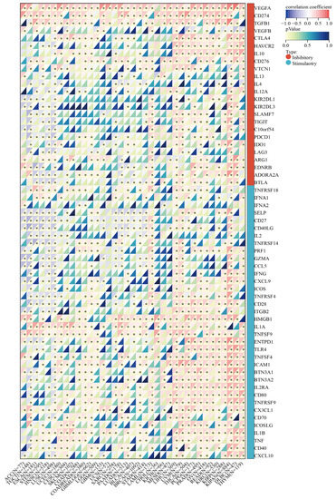Immune surveillance affects the growth and development of cancer cells, and cancer cells evade immune responses by taking advantage of ICP [27]. ICP genes are divided into two major categories: immunoinhibitors and immunostimulators. As such, we investigated the associations between SLC2A1 expression and the two main types of immune modulators in human cancers to explore the potential function of SLC2A1 in immunotherapy. The results showed a certain correlation between SLC2A1 and immune modulators in all 33 tumor types. We found that the expression of SLC2A1 is positively correlated with most immunoinhibitors and immunostimulators in LAML, LIHC, UVM, THCA, PCPG, PRAD, OV, READ, KIRC, KIPAN, DLBC, and THYM. In contrast, the expression of SLC2A1 is negatively correlated with most immunoinhibitors and immunostimulators in TGCT, ESCA, STES, HNSC, and LUSC. Notably, SLC2A1 is remarkably positively correlated with CD274 (PD-L1) and CTLA4 in most cancers (Figure 14). These findings suggested that SLC2A1 may affect the immune checkpoint blockade treatment response in human cancers.