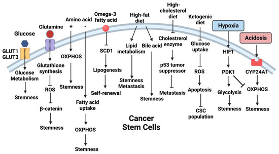Diet determines the nutrient availability in the microenvironment where CSCs are exposed to, that in turn alters CSC metabolism [81].