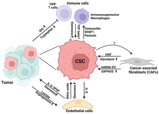 The presence of heterogeneous cell populations within the tumor bulk are well characterized in different cancers [18,94]. CSCs, non-CSC counterparts, cancer-associated fibroblasts, endothelial cells, immune cells, and other cell populations interact with each other and contribute to the regulation of tumor development and progression [95] (Figure 2). Their interactions in the tumor niche have been extensively reviewed previously, with the focus on their crosstalk through signaling molecules such as cytokines and chemokines [96]. In particular, inflammatory molecules have been shown to impact CSC phenotypes [97,98]. However, the metabolic connection between CSCs and neighboring cells in TME has not been systematically reviewed.