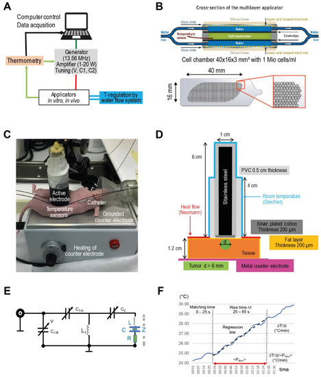 (A) Experimental system. Schematic of LabEHY-200 system for preclinical in vitro and in vivo studies. With reference to the clinical system EHY-2000+ [8], we initially set the AM-spectrum to 100/f (f ≥ 100 Hz). (B) In vitro applicator. Schematic cross-section of the in vitro applicator, which is suitable to adjust the power density (via Padj) and temperature (via water flow system) separately. The grid-shaped electrodes (below) enabled enlargement of the cell chamber volume (green) up to ~2 mL. (C) In vivo applicator. Components of the in vivo applicator in situ as positioned upon an implanted HT29 tumor in a nude mouse. (D) Model of in vivo applicator. The exposed volume is much smaller than for the in vitro applicator, resulting in a Padj = 1 W. Particularly, calculating temperature distributions is a nontrivial task because of this complicated geometry. (E) Tuning circuit. Tuning circuit for the in vitro applicator with adjustable capacitances C1/C2, which are controlled by the voltage V. The complex impedance Z is specified by the fixed inductance L (air coil) in a pre-tuning unit, the capacitance C and a variable lossy resistance R, depending on the load and operation mode. (F) Evaluation procedure for the temperature gradient after the power is turned on. Standardized evaluation of ΔT/Δt (°C/min) in the in vitro applicator after switching on the power (Padj = 10 W) under flow conditions in three steps (1–3): (1): Fixed tuning time of 25 s to achieve <Pdiss> = Padj with a reflected power of <5%. (2): Determination of the slope ΔT/Δt of the regression line in the time interval 25–85 s (red line). (3): Correction of the temperature gradient with respect to the mean Pdiss during this time interval.
