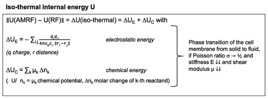 If we measure different (ΔT/Δt)corr(AMRF) < (ΔT/Δt)corr(RF) after correction for Pdiss (according to Figure 1F), such a difference suggests that isothermal power is deposited in the sample, which is caused by AM. Isothermal energy can primarily be stored electrostatically and chemically as quantified on a microscopic level by the equations in Figure 2 (left panel). A long-term macroscopic correlate for isothermal energy depositions are phase transitions (Figure 2, right panel), which we would expect particularly in cell membranes that can exhibit a transition from a solid to a fluid state at a certain temperature.