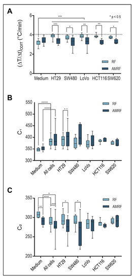 For each of the five cell lines and the RPMI medium, 6 short experiments, i.e., 2 triplicates, were performed per arm (RF versus AMRF) to screen the physical data ((ΔT/Δt)corr, C1, C2, tmeas = 10 min). Four cell lines (HT29, SW480, LoVo, and HCT116) were selected for further analysis that showed the highest differences in physical parameters between the medium and cell suspensions and between RF and AMRF exposition.