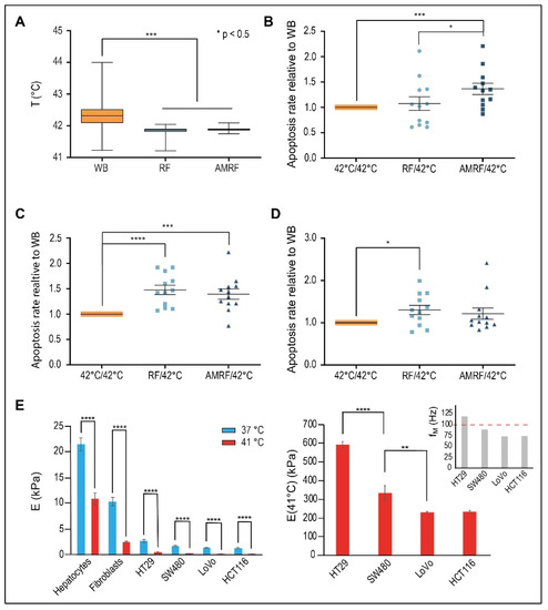 (A) Measured temperatures in vitro. Mean temperatures during the 60-min treatment time measured in the cell chamber for RF or AMRF in comparison to the water bath (WB). A sample of 26 biological experiments enclosing all cell lines was evaluated. (B) Normalized apoptosis rate in vitro for HT29 cells. Evaluation of apoptosis rates (annexin V+) for HT29 cells in suspension in the in vitro applicator comparing RF and AMRF versus those of cells in a water bath adjusted to 42 °C by normalizing to the mean apoptosis rate of the WB experiments. Significantly higher apoptosis rates are detected in the AMRF arm. Estimated ground natural frequency of the membrane fM is covered by the AM spectrum (see (E)). (C) Normalized apoptosis rate in vitro for SW480 cells. Apoptosis rates are equally enhanced in the RF and AMRF arms. Estimated ground natural frequency of the membrane fM is slightly below the AM spectrum (see (E)). (D) Normalized apoptosis rate in vitro for LoVo cells. Apoptosis rates are equally enhanced in the RF and AMRF arms. Estimated ground natural frequency of the membrane fM is clearly below the AM spectrum (see (E)). (E) Young´s moduli E for different cell lines and temperatures, as determined by atomic force microscopy indentation. The overview (left panel) shows that normal issue cells (hepatocytes and fibroblasts) have higher E than cancer cells. A significant drop of E occurs for each cell type as the temperature increases from 37 °C to 41 °C. The more detailed representation (right panel) shows that the moduli at 41 °C significantly differ between cancer cells and lead to different resonance frequencies fM, which are below or above 100 Hz, according to Equation (4) (Section 2 Methods): fM = 120 × E1/2 × (1/a2 + 1/b2). Significance was defined as p < 0.05 and marked with * (< 0.005 with **, etc.)
