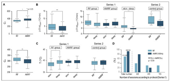 Although we measured lower thermally relevant dissipated power for AMRF exposure (e.g., 40% reduction for Series 2), the final mean temperatures <Tmax> in the steady state were not reduced and, in particular, were more homogeneously distributed, i.e., showed a smaller difference (ΔT/Δt)skin − (ΔT/Δt)deep (compare the RF and AMRF groups, Figure 6C, left panel).