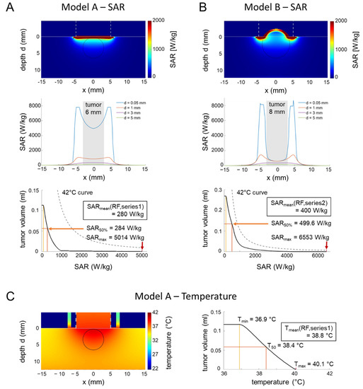 The conditions are more complicated for the in vivo applicator and prompted us to carry out SAR and temperature simulations. Our calculations yielded strongly nonhomogeneous SAR distributions for two models; A and B (Figure 7A,B upper/middle row), corresponding to the two tumor growth stages of Series 1 and 2. Outside the tumors, applicator edge effects generated SAR maxima (see profiles at depth d = 0.05 mm) that might cause skin irritations at these locations (Figure 6B). However, the SAR volume histograms of the tumors (of either 6 or 8 mm in diameter) revealed that the volumes in the tumors with excessive SAR (up to 6500 W/kg) are too small (<0.1 mL) to induce a significant localized temperature increase, as estimated by the 42 °C curves (see Methods, Equation (3)), resulting in intratumoral temperatures far below 42 °C (Figure 7A,B bottom). Even when considering the temporal peak power levels of the modulated wave (up to 150% for m = 0.5), the peak SAR values will not induce a temperature increase of 2 °C or more (see Methods, Equation (3)). The calculated SAR50 in the tumors are consistent with the mean values of our measurements (see inlay, Figure 7A,B, third row).
