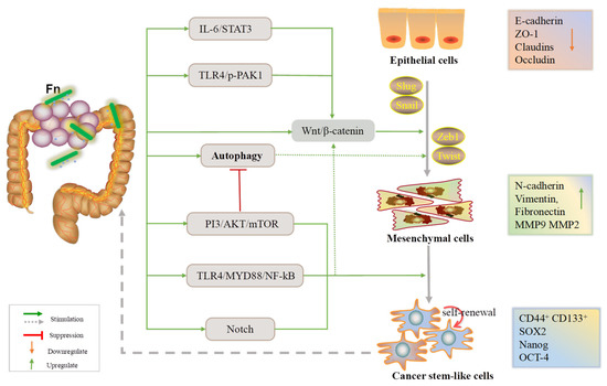In addition to the E-cadherin/β-catenin complex, cancer stem-like cells (CSCs) are responsible for cancer progression and the recurrence and metastasis of tumor cells [33,34,35]. Emerging evidence shows that non-CSCs can acquire stem-like features during EMT. The levels of EMT markers (E-cadherin, N-cadherin, and ZO-1) and CSC markers (Nanog, Oct-4, Sox-2, CD44+, and CD133+) is significantly correlated with the abundance of Fn in CRC tissues [35,36,37]. To determine changes in the morphology of CRC cells, Yu et al. [36] cultured HCT8, LOVO, and LS174T cells infected with Fn for 24 h. They found that HCT8 and LOVO cells displayed an elongated shape rather than epithelial cell morphology, and the proliferative activity of cells was promoted. It was further certified that Fn promotes EMT through EGFR/AKT/ERK signaling. Recent observations suggest that Fn infection affects not only colorectal cancer stem-like cells (CCSCs) but also non-CSCs. Fn activates Notch signaling to promote both acquisition of stem-like features by non-CCSCs in addition to CCSC self-renewal via TLR4/MYD88/NF-κB [37].