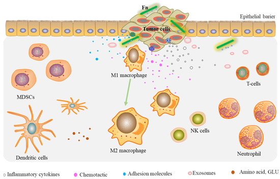 Fn infection can recruit tumor-infiltrating immune cells, in particular myeloid-derived suppressor cells (MDSCs), tumor-associated macrophages (TAMs), tumor-associated neutrophils (TANs), and dendritic cells (DCs), thereby suppressing potent immunity in CRC [40,41,42].