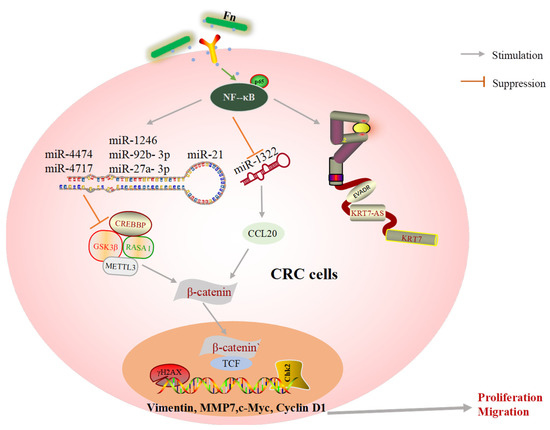 MicroRNAs (miRNAs) are small ncRNAs. Numerous miRNAs have been found to be upregulated or downregulated in human tumors. The dysfunction of miRNAs in turn disturbs the expression of either tumor promoter or tumor suppressor [61,62]. Guo S et al. [29] suggested that exosome miRNAs exhibit a variety of biological functions during Fn infection. For example, exosomes could deliver miR-1246/92b-3p/27a-3p from Fn-infected cells into uninfected cells to promote migration behaviors, and the level of GSK3β, the target gene of the oncogenic miRNAs, was found to be significantly reduced in exosomes from Fn infection CRC cells. A study characterizing several miRNAs and genes associated with the development of Fn-induced CRC found that approximately 121 miRNAs were aberrantly expressed in CRC tissue following Fn infection. Among these miRNAs, the expression levels of miR-4474 and miR4717 were significantly increased, while the target gene, CREBBP, was decreased in CRC tissue exposed to Fn [20,21]. Fn infection also enhances the tumor formation ability of xenografts and increases the levels of inflammatory factors in mouse model [18]. Approximately 50 miRNAs are found to be significantly upregulated in CDX mice, and the level of miR21 increases by more than four-fold. Furthermore, Fn infection not only induces the expression of miR21 but also reduces the level of RASA1 via the TLR4/MYD88/NF-κB signaling pathway [18]. In addition, some important miRNAs are lost in CRC tissues after Fn interference. Xu et al. [46] found that chemokine CCL20 tended to increase in patients with stage IV metastatic CRC. Using luciferase reporter experiments, they also found that miR-1322 could directly bind to CCL20, and its expression was found to be negatively associated with Fn abundance and CCL20 levels. These findings indicate that Fn infection promotes CRC metastasis via the miR-1322/CCL20 axis. FOXD3 is a transcription factor for METTL3, an m6A methyltransferase, and there is evidence that Fn could diminish the expression of FOXD3 and suppress the transcription of METTL3 via YAP pathway activation. Its target, KIF26B, is promoted by the decline in m6A modifications and mRNA degradation, which are responsible for Fn-related CRC metastasis [22].