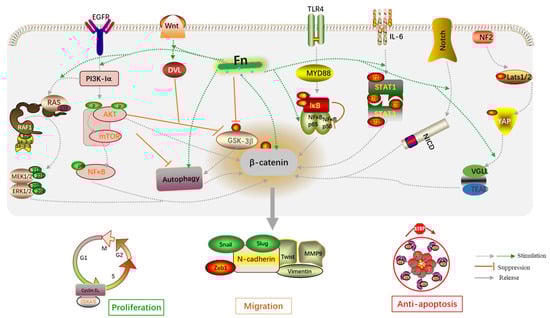 In addition, the biological behaviors of host cells induced by Fn infection are transmitted through signaling pathways. Wnt/β-catenin, TLR4/NF-κB, IL-6/STAT3, autophagy, AKT/ERK, CXCL16/IL-8, and Hippo-YAP are classical signaling pathways derived from Fn infection and included in this review (Figure 5). The dysregulation of Wnt/β-catenin signaling has been demonstrated to drive cancer cell proliferation, invasion, and migration. For example, the Wnt/β-catenin pathway can be activated by miR-454-3p-mediated suppression, thereby promoting breast cancer metastasis [73]. RUNX1 promotes CRC metastasis through the induction of Wnt/β-catenin signaling and the EMT [74], while cinobufacini can inhibit CRC invasion and metastasis by inhibiting the Wnt/β-catenin–EMT pathway [75]. NF-κB has been widely implicated in the angiogenesis, proliferation, and metastasis in CRC, owing to crosstalk with other signaling pathways. B7-H3 and SREBP1 can increase angiogenesis of endothelial cells by promoting the phosphorylation of NF-κB p65 [76,77]. Additionally, upregulation of MMP7 driven by NF-κB promotes the invasion and metastasis of CRC cells [77]. Experiments have shown that cancer-associated fibroblasts upregulate the inflammatory protein LRG1 as well as inducing the EMT to promote CRC cell invasion and migration through the IL-6-STAT3 axis [78]. The IL-6/STAT3 pathway also affects the tumor-infiltrating immune cells in the TME in CRC and protects cancer cells from apoptosis [79]. In summary, the abnormal activation of these classical signaling pathways is indeed a key mechanism by which Fn infection promotes CRC cell proliferation and metastasis.