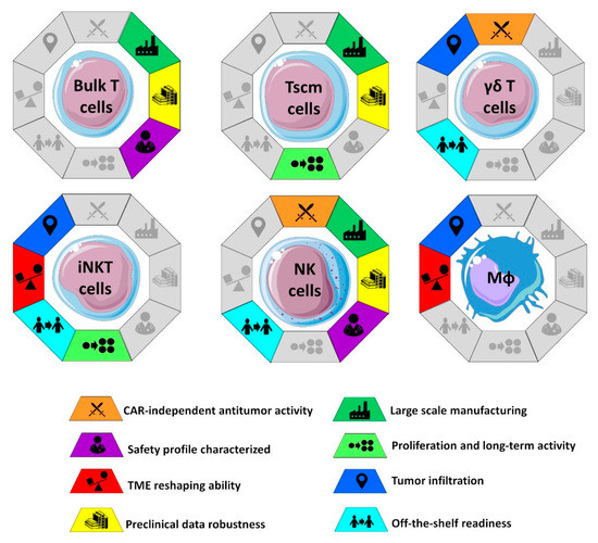 One of the most debated aspects of CAR-based therapies is the choice of the cell population to be genetically engineered for the expression of CAR. Since CAR-engineered cells will represent the active substance of final product, the choice of cell population has a deep impact on large-scale manufacturing and “off-the-shelf” potential of the CAR therapy: Two critical points that will strongly dictate the future of CAR-based therapies for solid tumors in terms of clinical availability and economic sustainability (Figure 1) [49,50]. Moreover, since different immune cells exhibit different mechanisms of action and subsequent antitumor activity, each carrying advantages and challenges, the choice of the cell type will affect the in vivo clinical efficacy of CAR-based immunotherapy.