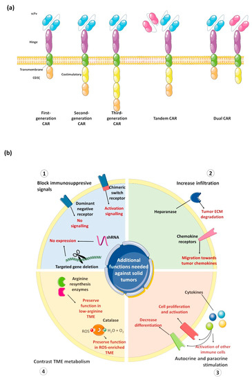 CAR designs against solid tumors. (a) Typical design of most common CAR constructs, from historical first-generation CAR construct to constructs simultaneously targeting two targets; (b) schematic representation of major strategies explored to overcome resistance of solid tumor to CAR-based therapies. The Figure was partly generated using Servier Medical Art, provided by Servier, licensed under a Creative Commons Attribution 3.0 unported license.
