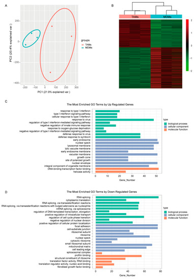 Comparison of the transcriptomes induced by medium from MDMs or TAMs. (A) The PCA figure of the MCF7 transcriptomes. (B) Heatmap of DEGs in MCF7 transcriptomes induced by either MDMs or TAMs. (C,D) GO enrichment analysis of the upregulated and downregulated DEGs separately. The pathways shown here were most significantly enriched (p < 0.05, q < 0.01).