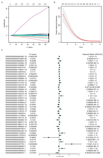 Development of the gene signature based on data in the TCGA-BRCA training cohort. (A) LASSO coefficient profiles of the DEGs. (B) Ten-time cross-validation for tuning parameter screening in the Lasso–Cox penalized regression model. (C) Univariate Cox regression analysis of the relation between the expression of the 45 signature genes and the overall survival in the TCGA-BRCA cohorts. HR, hazard ratio; CI, confidence interval.
