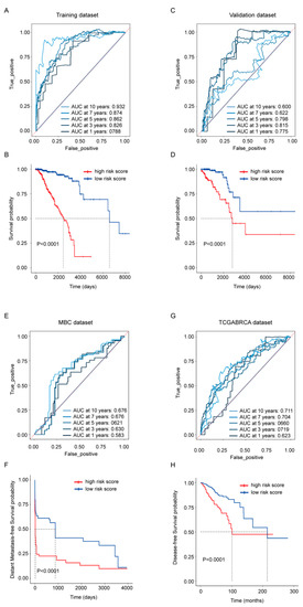 To evaluate the gene signature’s ability in predicting survival, risk scores were calculated by the sum of the expression of each gene multiplied with its coefficient from the LASSO Cox regression. Its OS predictive ability was presented in the TCGA-BRCA training (Figure 3A,B) and validation dataset (Figure 3C,D) separately; its distant metastasis-free survival predicative ability was evaluated in the MBC cohort (Figure 3E,F); the whole TCGA-BRCA cohort was also employed to exhibit its disease-free survival predictive ability (Figure 3G,H). The ROC curves from the TCGA-BRCA training dataset and validation dataset revealed that the risk score exhibited a more stable predicative ability in shorter time points, and the AUC at 3 years was above 0.8 in both datasets. At the time point with the largest AUC, Kaplan–Meier analysis was performed, and the results showed that the OS rate between high- and low-risk score groups were statistically different in both datasets as well (p < 0.0001) (Figure 3B,D). Compared with its robust OS predicative ability, the risk score’s ability in predicting the distant metastasis-free survival and the disease-free survival was weaker (Figure 3E,G), but patients dichotomized by the risk score still exhibited statistical difference (p < 0.0001) in the Kaplan–Meier analysis (Figure 3F,H).
