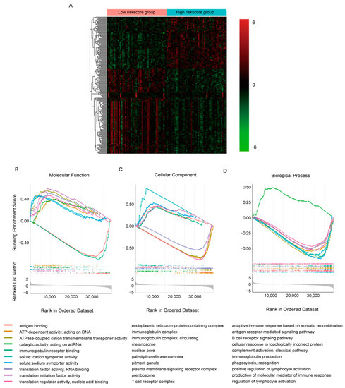 Comparison of the transcriptomes with different risk scores in TCGA-BRCA cohorts. (A) Heatmap of top 200 DE transcripts between samples with 50 highest/lowest risk scores. (B–D) GSEA plots of commonly enriched GO pathways in the TCGA-BRCA cohort. The pathways shown here were top 10 most significantly enriched (p < 0.05).
