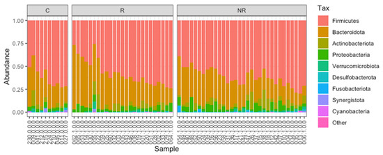 The gut microbiota composition (relative abundance) of the study cohort at the phylum level. Analyzed samples were grouped into C—controls, R—responders, and NR—non-responders.
