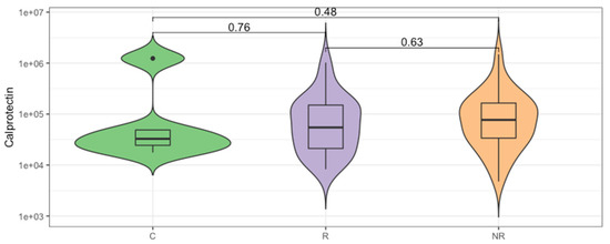 The inflammatory state of gut mucosa was evaluated by calprotectin concentration measurement in the stool of study participants. Comparison between groups of controls (C) and the anti-PD-1 recipients before the first injection of the ICI therapeutics, classified as responders (R) and non-responders (NR) according to the clinical outcome of ICI therapy. The p-values describing the statistical significance of the calprotectin level in the study groups were calculated with Wilcoxon Rank Sum Test. The plot is in a logarithmic scale.