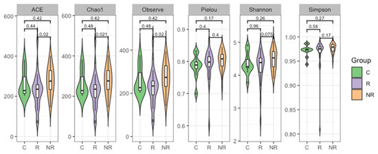 Plots depicting a comparison of bacterial ASV alpha diversity of the stool microbiota as estimated regarding richness (ACE, Chao1, and observed indices), evenness (Pielou index), and diversity (Shannon and Simpson indices) measures in study groups (R—responders, NR—non-responders, and C—controls). Wilcoxon Rank Sum Test indicated that the responder and non-responder groups’ microbiota differed in regards to richness (p < 0.05).