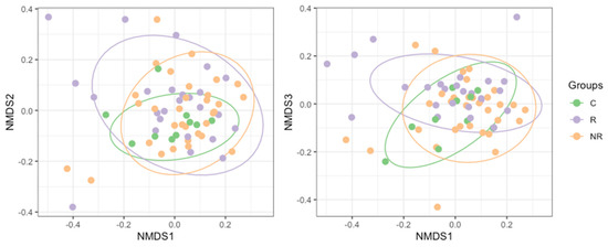 NMDS (non-metric multidimensional scaling) plot based on Bray–Curtis dissimilarity of the bacterial microbiota composition in study groups (R—responders, NR—non-responders, and C—controls). Permutation multivariate analysis of variance revealed significant differences between the groups (R2 = 0.0491 and p = 0.0089).